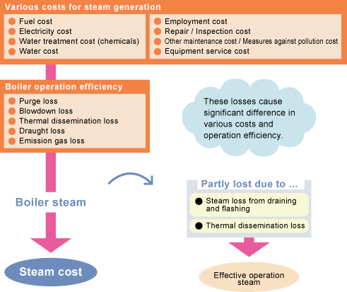 Costs for steam generation include the items shown in the figure. When it comes to steam cost, views vary from the mere fuel cost to the total cost for steam generation. Through boiler logs analysis and factory assessment, Miura has claimed that the comparison between effective steam and various costs is the real cost. What is your view? |