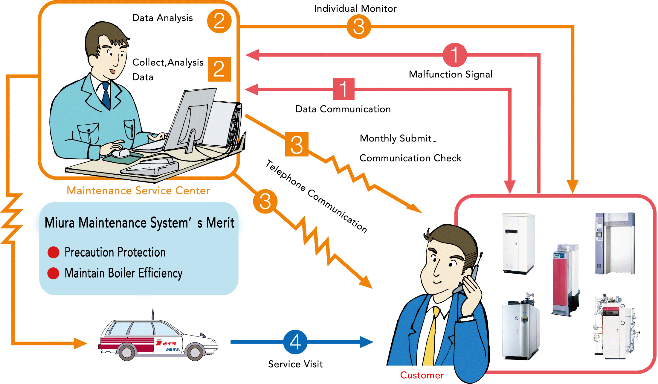 | We have service engineers nationwide. In addition to the ZIS Online Center in Headquarters, the Development Department Headquarters that is concerned with design and development is also online. Through the collective strength of all of Miura's companies, we are able to provide you with high quality online maintenance. |