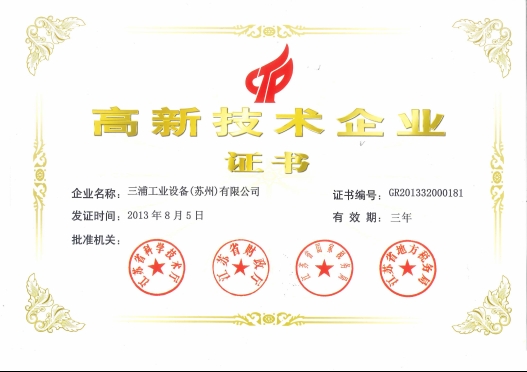 热烈庆祝三浦工业设备(苏州)有限公司荣获高新技术企业证书。