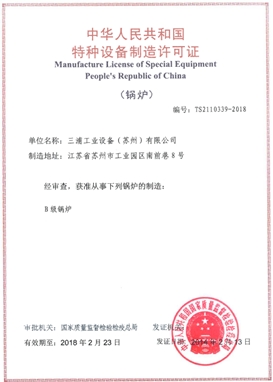 三浦工业设备(苏州)有限公司(所在地 中华人民共和国江苏省苏州市 代表董事长 儿岛好宏)接受了国家质量技术监督检验检疫总局的审核,通过了B级别锅炉生产许可证(特种设备制造许可证)的复审检查。于2月13日发行了许可证,允许制造压力在25kg/cm2以下的锅炉,有效期延至:2018年2月23日。