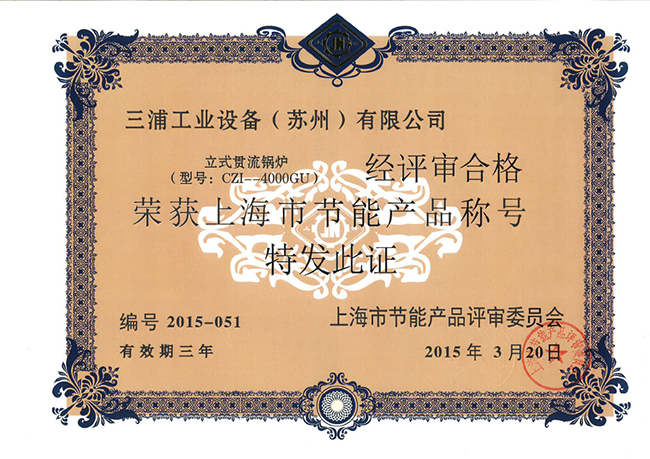 三浦贯流锅炉CZI-4000GU荣获上海市节能产品称号!