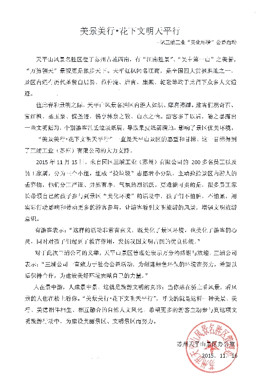 2015年11月15日,三浦工业(苏州)有限公司的200多名员工以及员工家属,组成捡垃圾志愿者小分队,主动捡拾天平山景区内游人的丢弃物,用实际行动影响并带动更多的游客参与,让游客增强了文明旅游的意识。