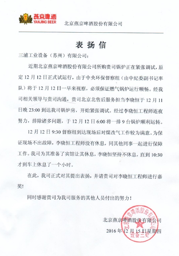 近日,三浦收到来自客户北京燕京啤酒股份有限公司的表扬信,信中对三浦员工李晓恒为了协助客户在规定期限前完成锅炉调试而一天一夜不眠不休,最终保障客户顺利完成目标的事迹提出表扬。