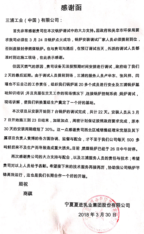 宁夏夏进乳业集团感谢函