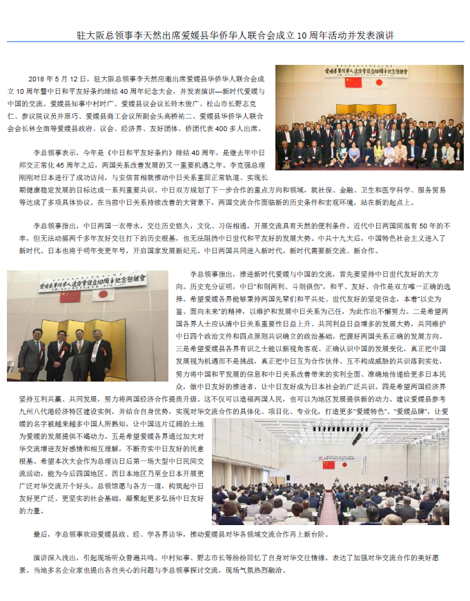 2018年5月12日,爱媛县华侨华人联合会成立10周年暨中日和平友好条约缔结40周年纪念大会成功召开。中华人民共和国驻大阪总领事李天然应邀出席并发表演讲。爱媛县政府、议会、经济界、友好团体、侨团代表400多人出席。三浦工业株式会社会长高桥祐二代表爱媛县商工会议所出席了该活动。