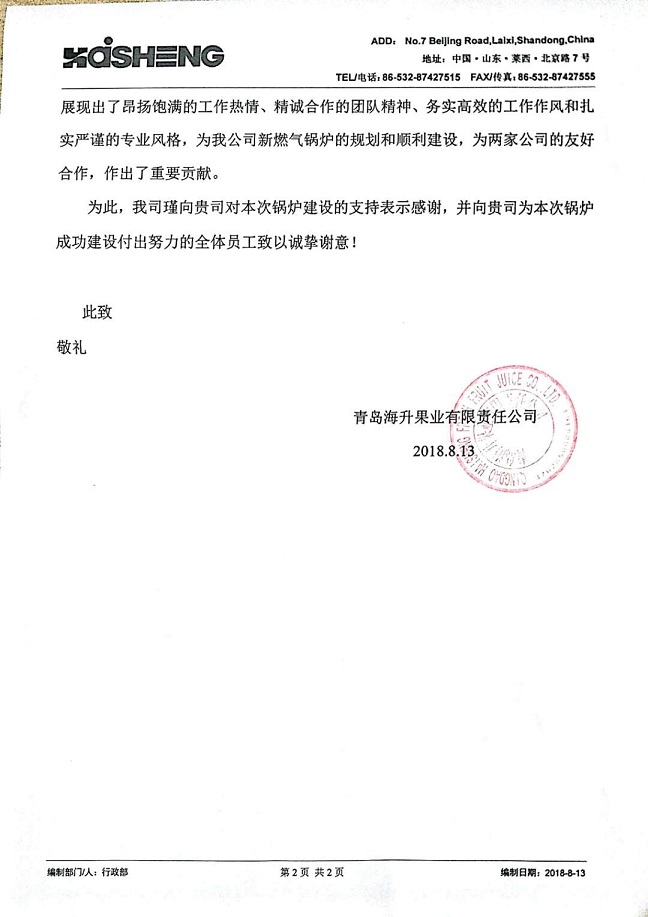 青岛海升果业感谢信