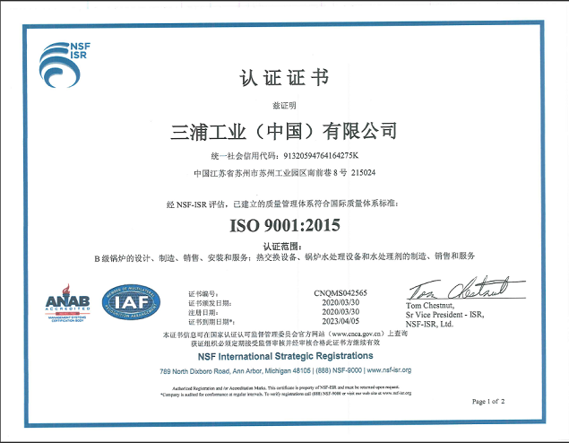 2020年4月,三浦工业(中国)有限公司接受江苏艾凯艾国际标准认证有限公司(NSF-ISR)的质量管理和环境管理审核,顺利通过了ISO9001/ISO14001认证证书的换证审核。