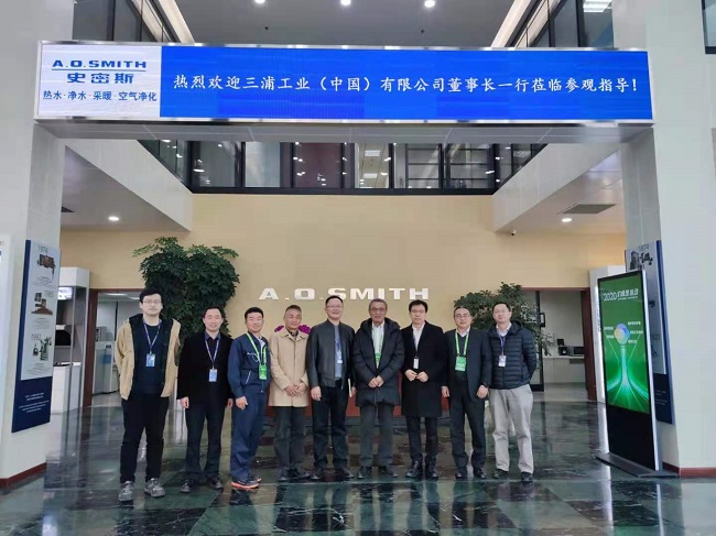 2021年3月9日 作为回访,三浦工业(中国)有限公司由儿岛好宏董事长领队,傅文军总经理,林隆宏副总经理,李一骧副本部长一行,访问了位于南京的艾欧史密斯中国公司。受到了邱步总裁,陈东商用营销总经理,杨国斌产品研发副总经理,马鸿飞商用研发总监等高级管理层的热烈欢迎。