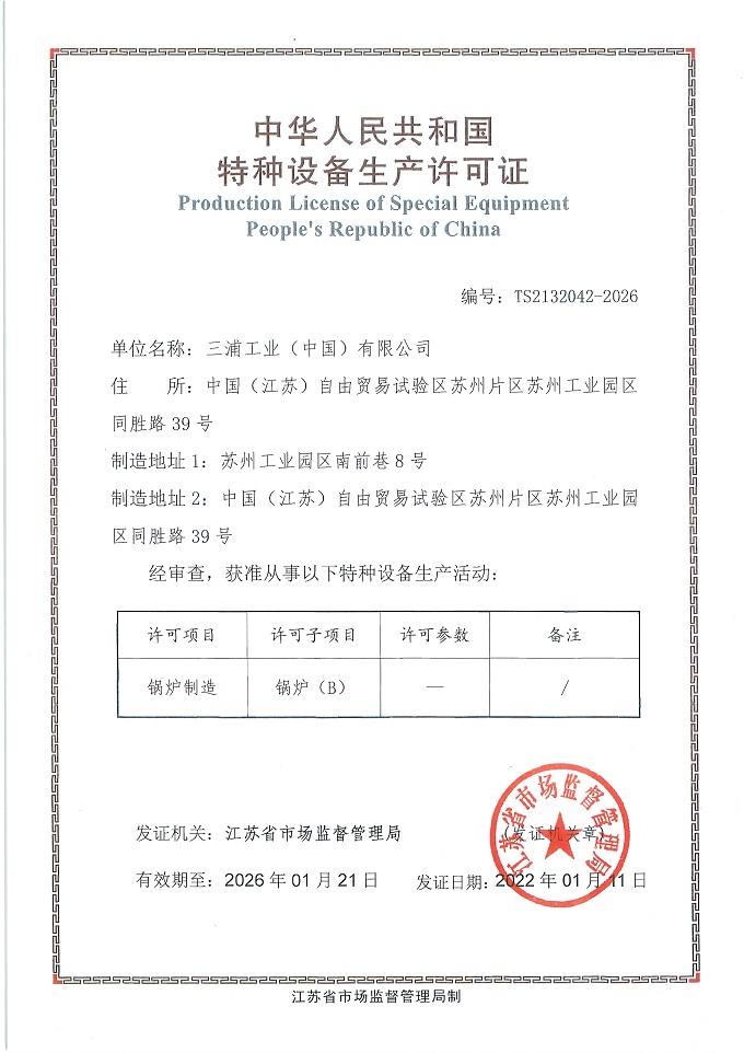 2021年12月,三浦工业(中国)有限公司接受了江苏省市场监督管理局的审核,通过了B级别锅炉生产许可证(特种设备制造许可证)的复审检查。