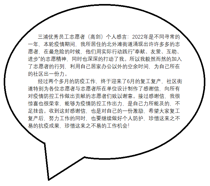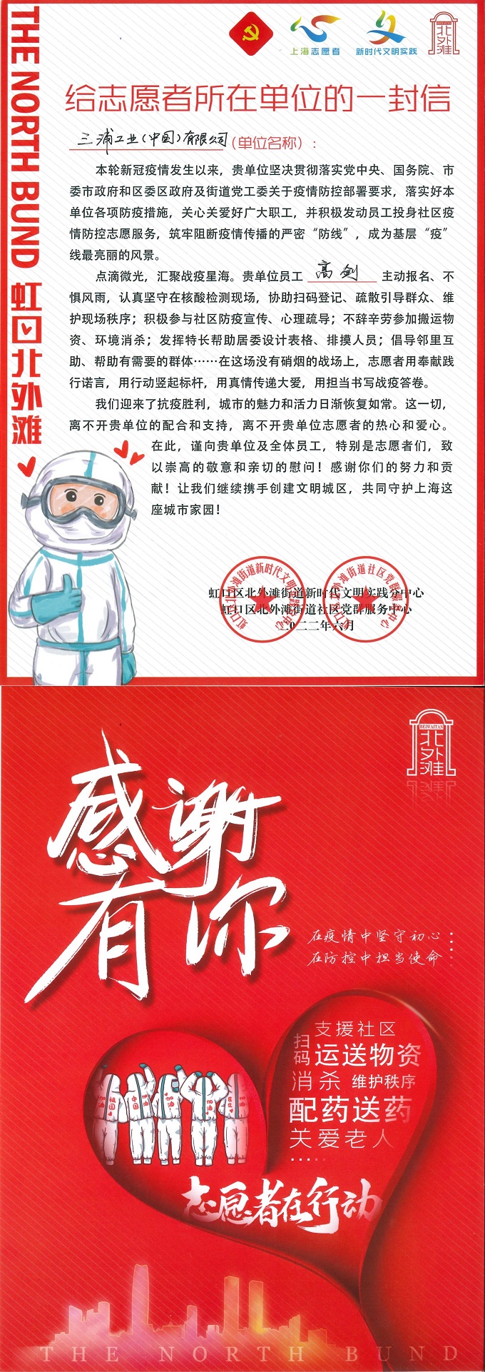 在2022年上海新冠疫情特别严峻的期间,三浦工业(中国)有限公司员工通过在线的方式给客户提供售前和售后服务的同时,在业余时间积极参加社区志愿者活动,无惧风险、不辞辛苦,他们与疫情防控工作人员携手作战、勇于担当、奋力作为,为社区群众生命健康筑起安全堡垒,为上海打赢疫情防控阻击战贡献着源源不断的动力。