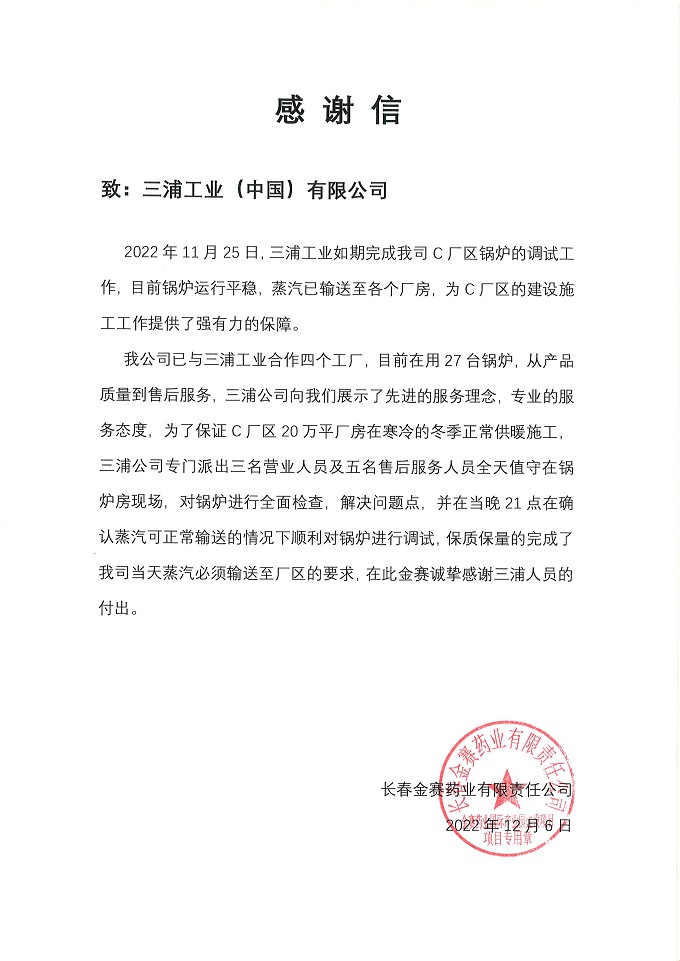 相信正式投产后,中国三浦依托专业的售后服务,保证锅炉运行效率达到最高水平,为长春金赛继续提供专业、有力的支持!