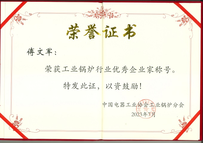 热烈祝贺傅文军总经理获得“中国电器工业协会工业锅炉分会优秀企业家称号”